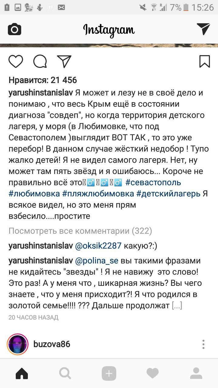 Российский актёр Станислав Ярушин, известный прежде всего по сериалам «Универ» и «Сашатаня», 2 июля на своей странице в Instagram оставил негативный отзыв о пляже детского лагеря в Любимовке.