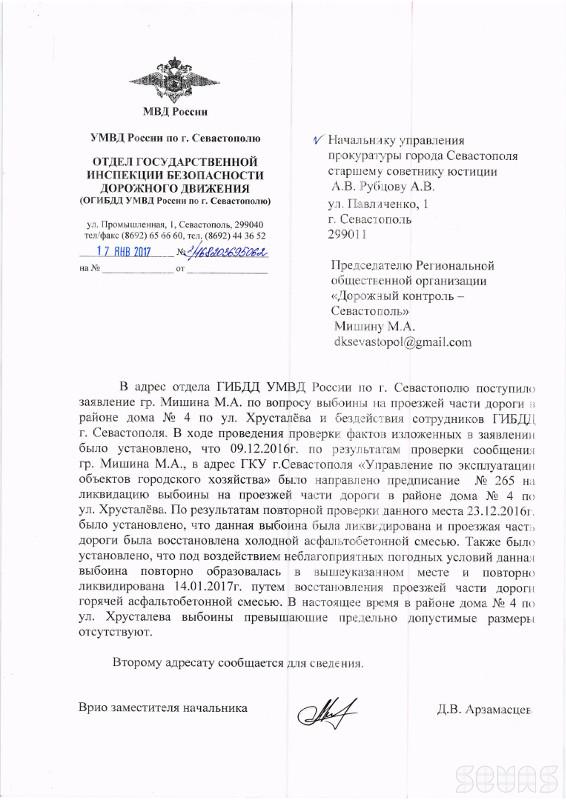 Он пообещал продемонстрировать «весь процесс от момента фиксации до решения проблемы», приложив для наглядности ответ севастопольской ГИБДД по поводу срочного ремонта ям, размеры которых превышают предельно допустимые нормы.